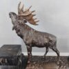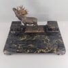 Dwuzbiornikowy kałamarz z czarnego włoskiego marmuru ozdobiony figurą łosia wykonaną z brązu.