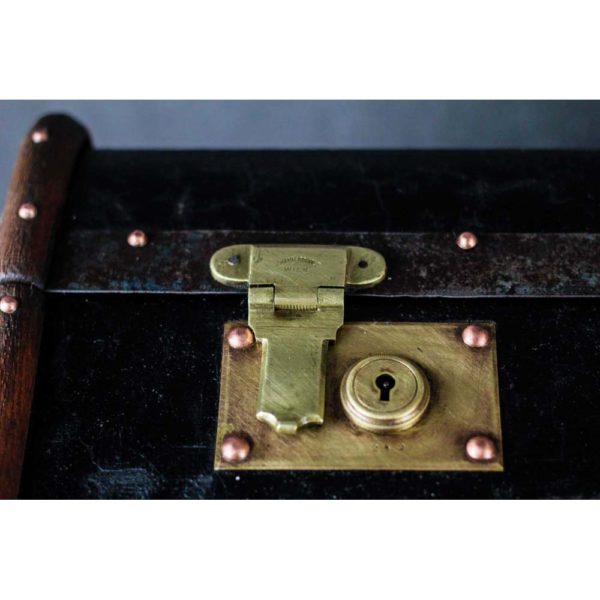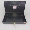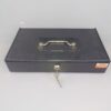 Metalowa kasetka na pieniądze zamykana na klucz.