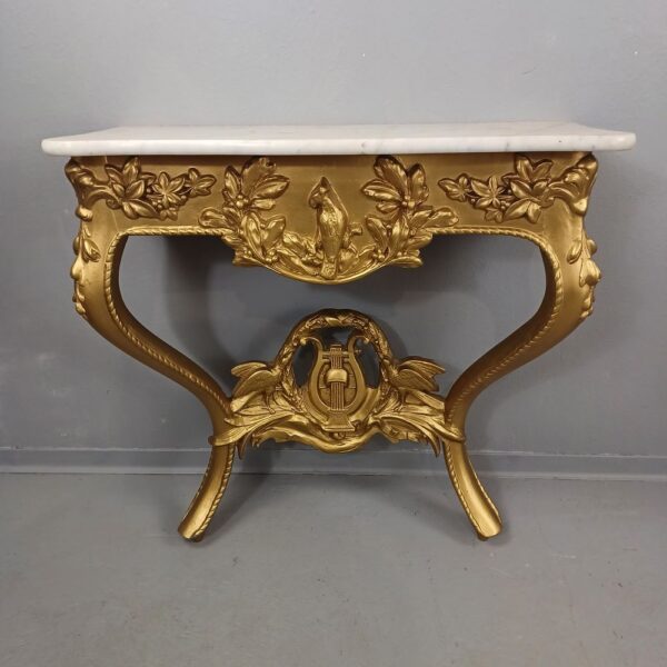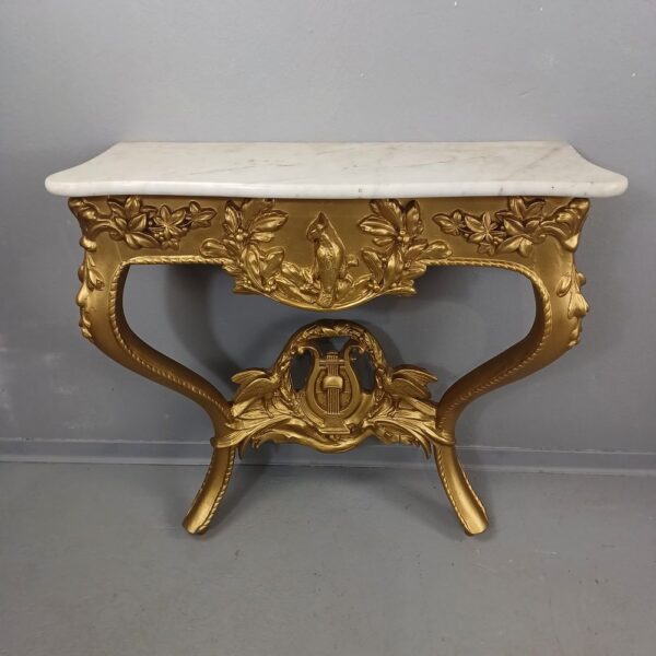 Konsola na nóżkach ludwikowskich z białym marmurowym blatem.